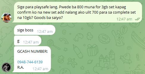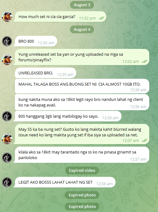 SCAMMER ALERT yung Spartan002889. Ako na nagsacrifice para lang ma-check kung legit or hindi. Save niyo nalang yung GCASH number kasi baka magpalit ng name sa TG at dito sa thread. Para kapag nakita niyo number for transaction alam niyo ng scammer ang ka-transact niyo.. Para sa ating mga matagal ng naghihintay ng unreleased set ni Cia Cia hintay lang tayo makaka hanap din tayo ng legit seller niya na matinong kausap. Ingat din kayo guys.